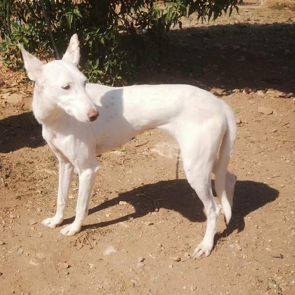 Jimena is a 9 year old Podenco Ibicenco, and we are sure you will agree she is spectacular! Now that she has started to settle into residencia kennels, she is already looking a 100% better - she's so WHITE! Jimena came is as one of the 6 adults from Almansa alongside Curra who we are certain is her sister - they are identical and very close, however, their passports say Jimena is 5 months older than Curra, so they may be half sisters (or the passports may be wrong!) Both girls are still very traumatised and nervous so will remain under assessment for a while until the decompress and settle in.