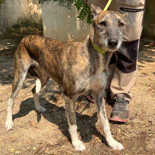 Luna is one of the 6 dogs recently seized and taken on by PINS. She is sister to Estrella (mum of the puppies) and is a podenco x galgo, though possibly has something else in the mix too. She is a real beauty with her rich brindle and white coat, her fuzzy face and those wise, soulful eyes. Luna loves human attention and gets on great with the other dogs she's met.