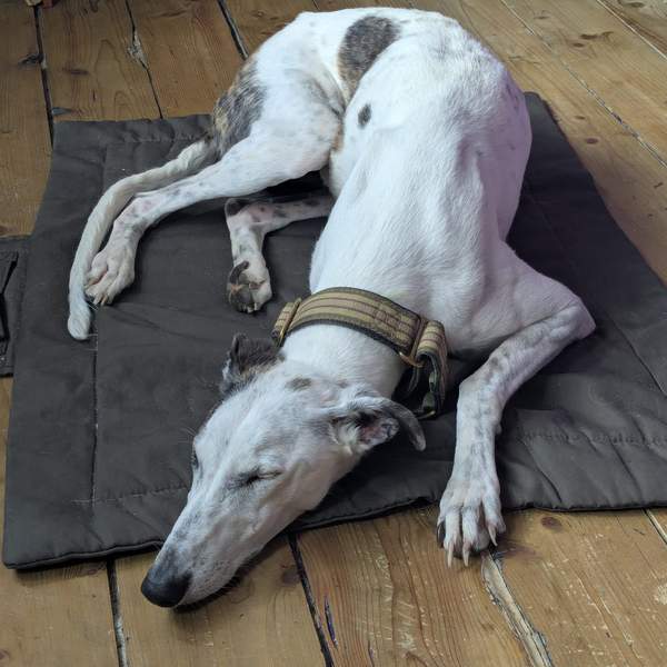 Sparkles is a beautiful white galga with grey/brindle patches and "sparkles" through her coat. She was born 15/6/23 so is just a youngster and was surplus to requirements so came into our care recently with her friend Storm. She seems a reasonably confident girl and is friendly with the other dogs and happy to accept strokes and affection from Corinna. Sparkles still needs to be spayed, blood tested and her vaccines updated, but we can take applications based on her being ready to travel in Feb or March.