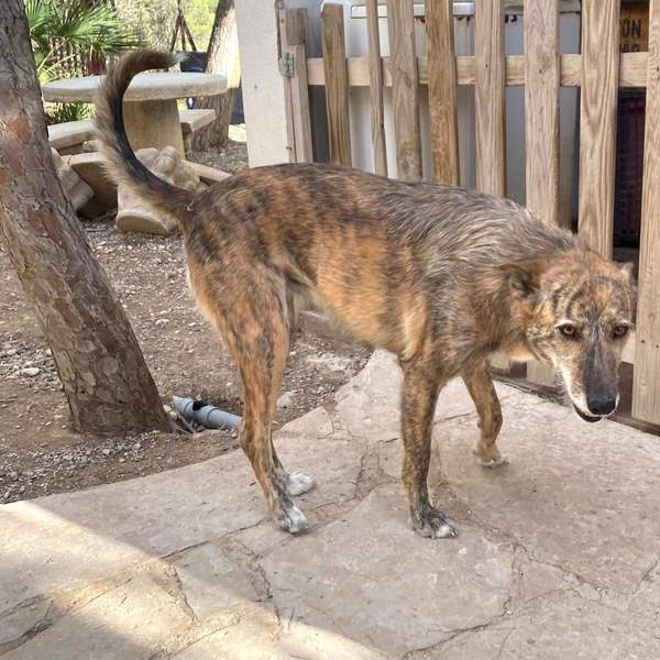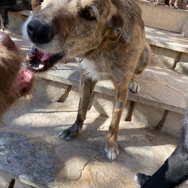 Estrella is proving herself to be a happy, friendly loving dog. She doesn't appear to be fearful and likes human company as well as the other dogs. She seems way too interested in the cat for us to say she may be cat workable, so a home with no small furries please Estrella is Luna's sister and is mum to the pups, so she has gone to a different residencia to let her stay with her babies as she enjoys their company so much. A pod x galgo, like Luna, she has a lovely brindle coat and just the perfect amount of fuzziness. She is a sweet natured girl who loves to play with her babies and loves a bit of human affection too.